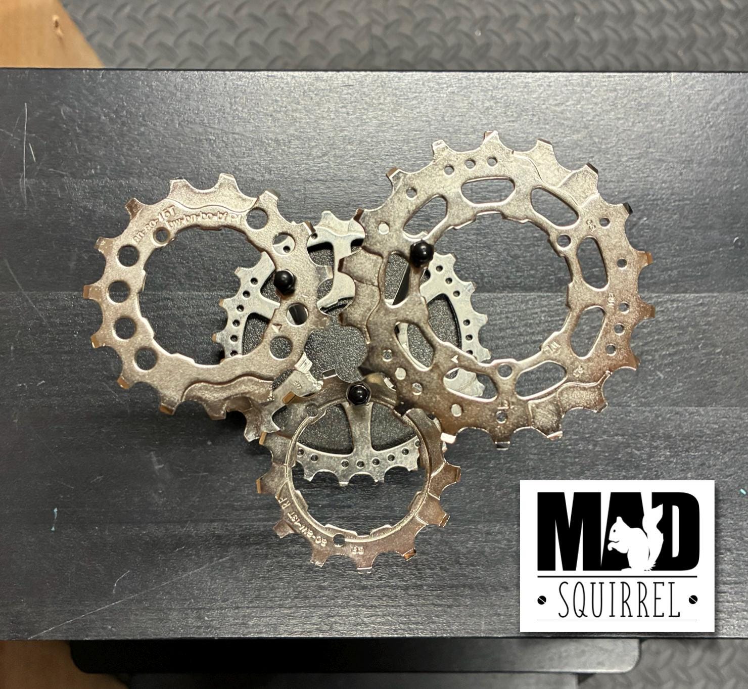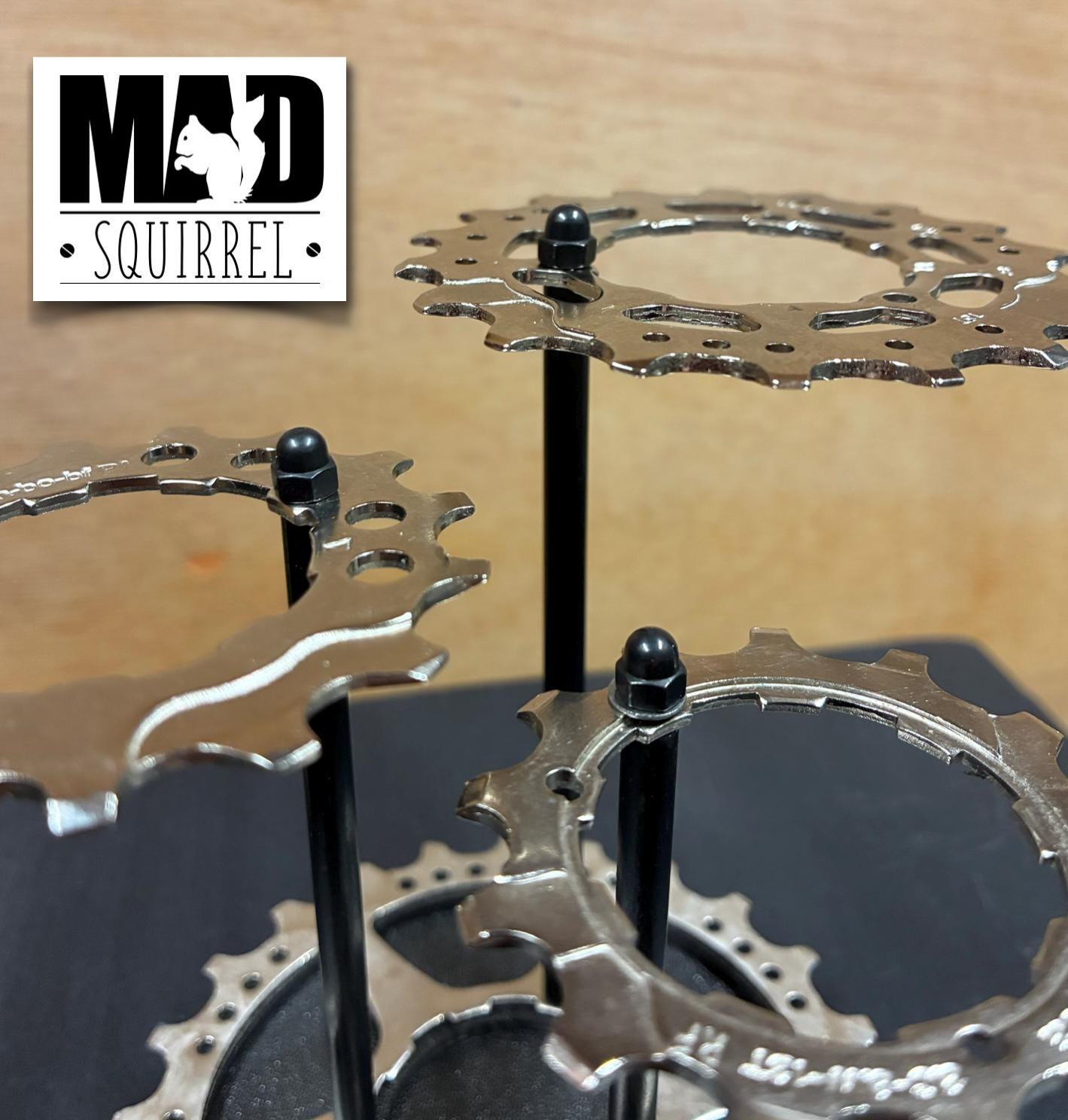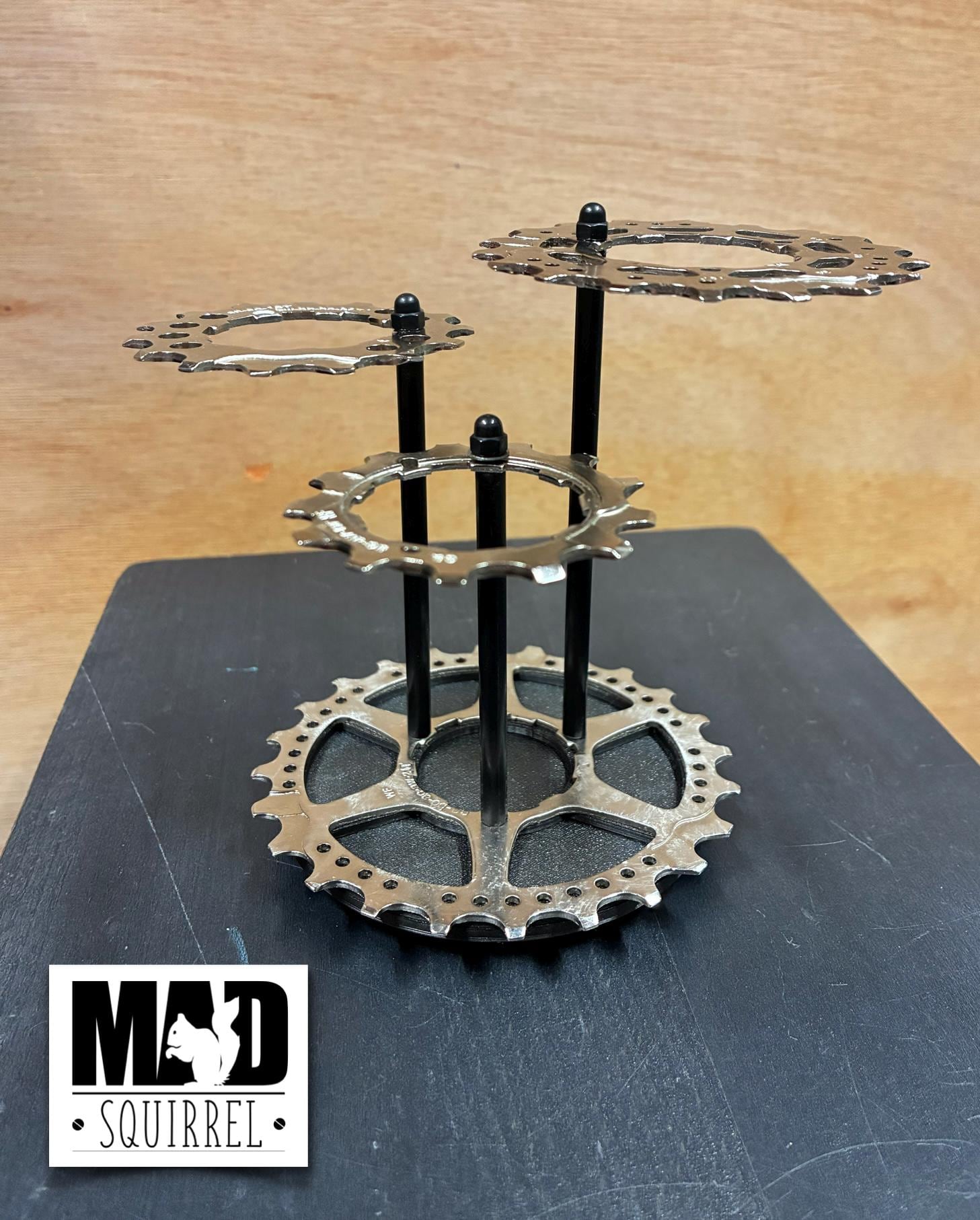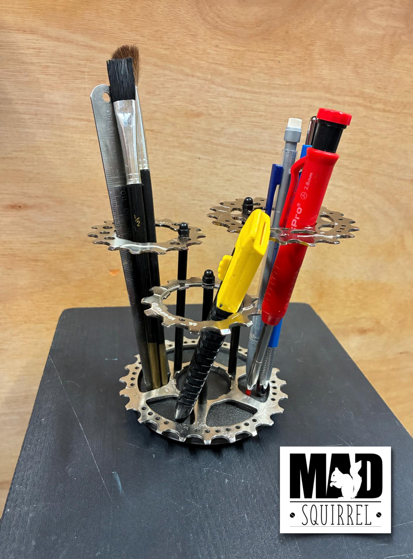 This newly restyled beautifully pen holder is ideal for pens, pencils, brushes and tools. It uses 3 different sized small sprockets for the top rings and a larger one for the base, they are all from a rear cassette and carbon fibre tubes holding the smaller sprockets in place at different levels for items of differing heights. There are black domed nuts on the top sprockets to finish the pen holder off.