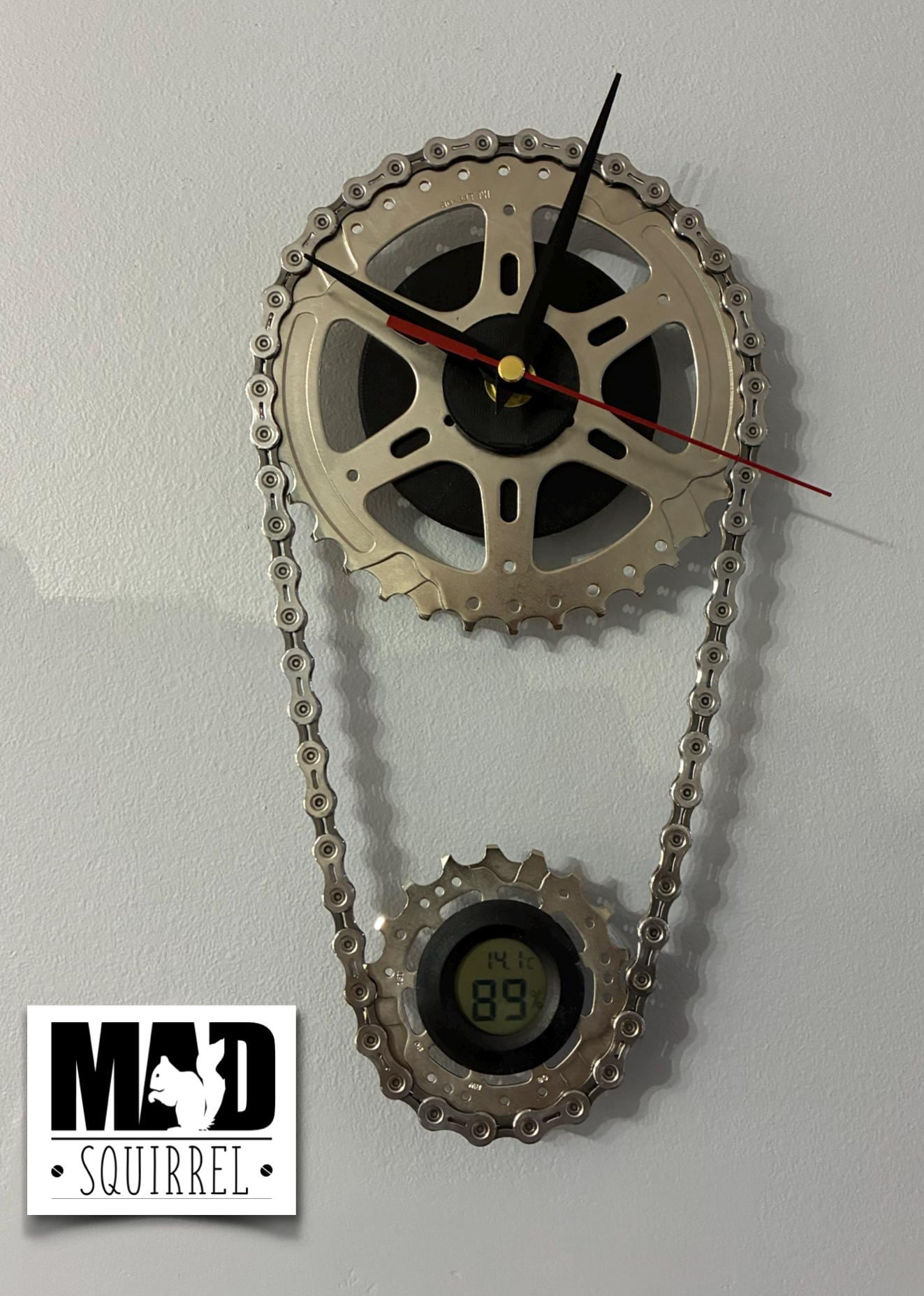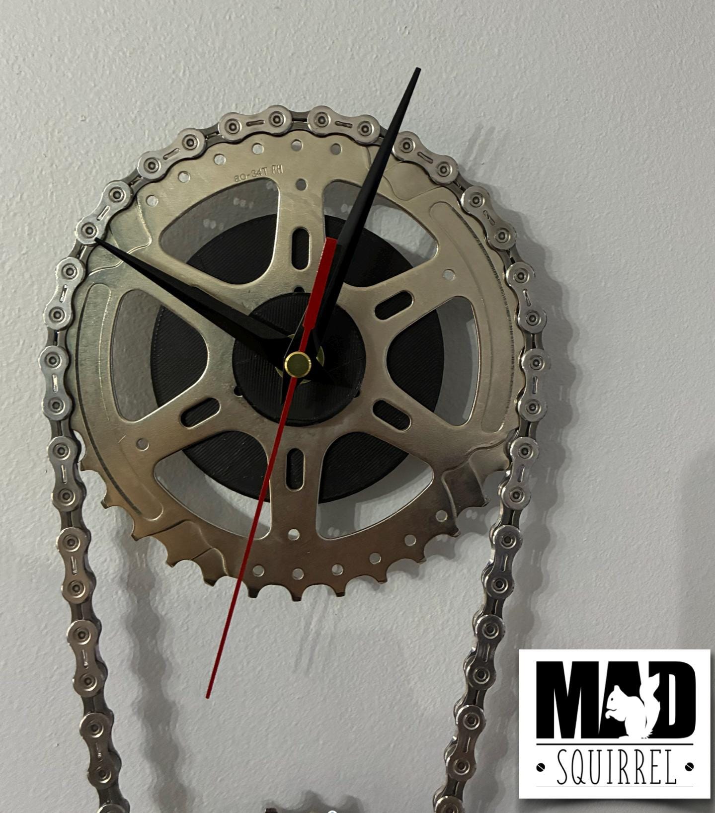 A wonderful unique clock made for 2 sprockets from a rear cassette, one large one and a smaller one, plus Shimano Chain, with Black and Red Hands