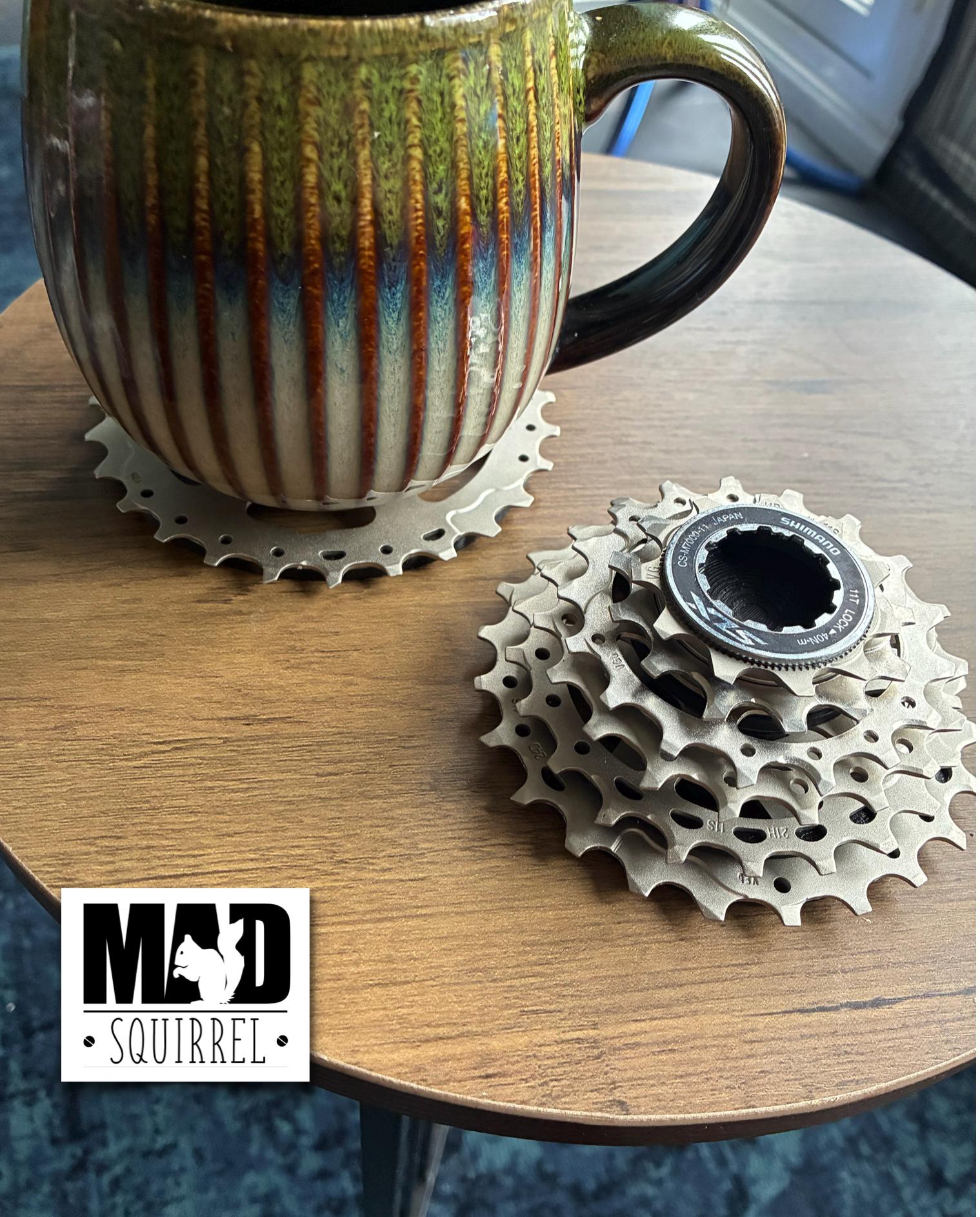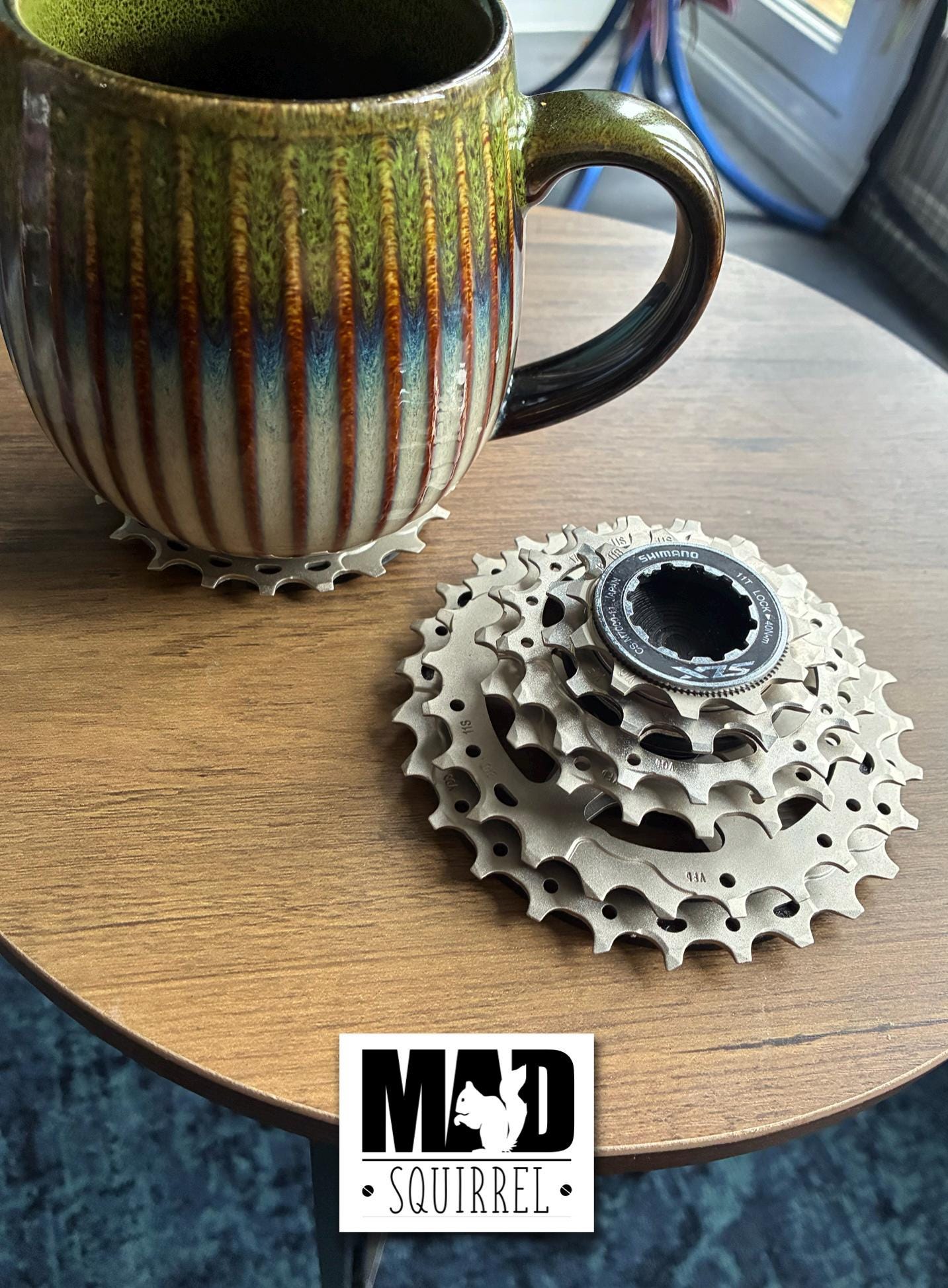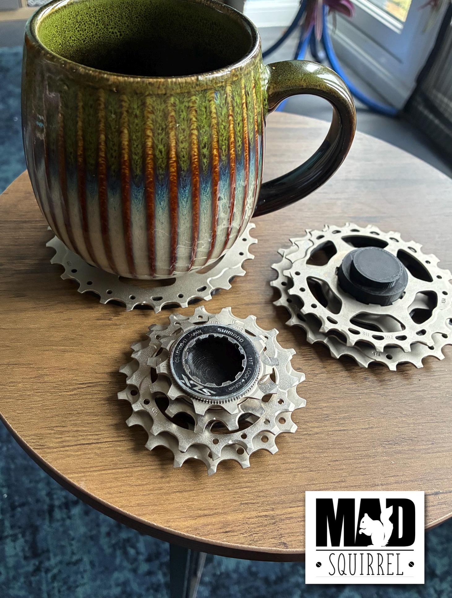 On the underside of the coaster there is a 3D printed plastic ring that keeps any hot cup/mug off a surface and keeps the sprocket from marking what it’s on. The ring also allows the coasters to be stacked nicely and gives the illusion of the rear cassette being complete and not a set of coasters.