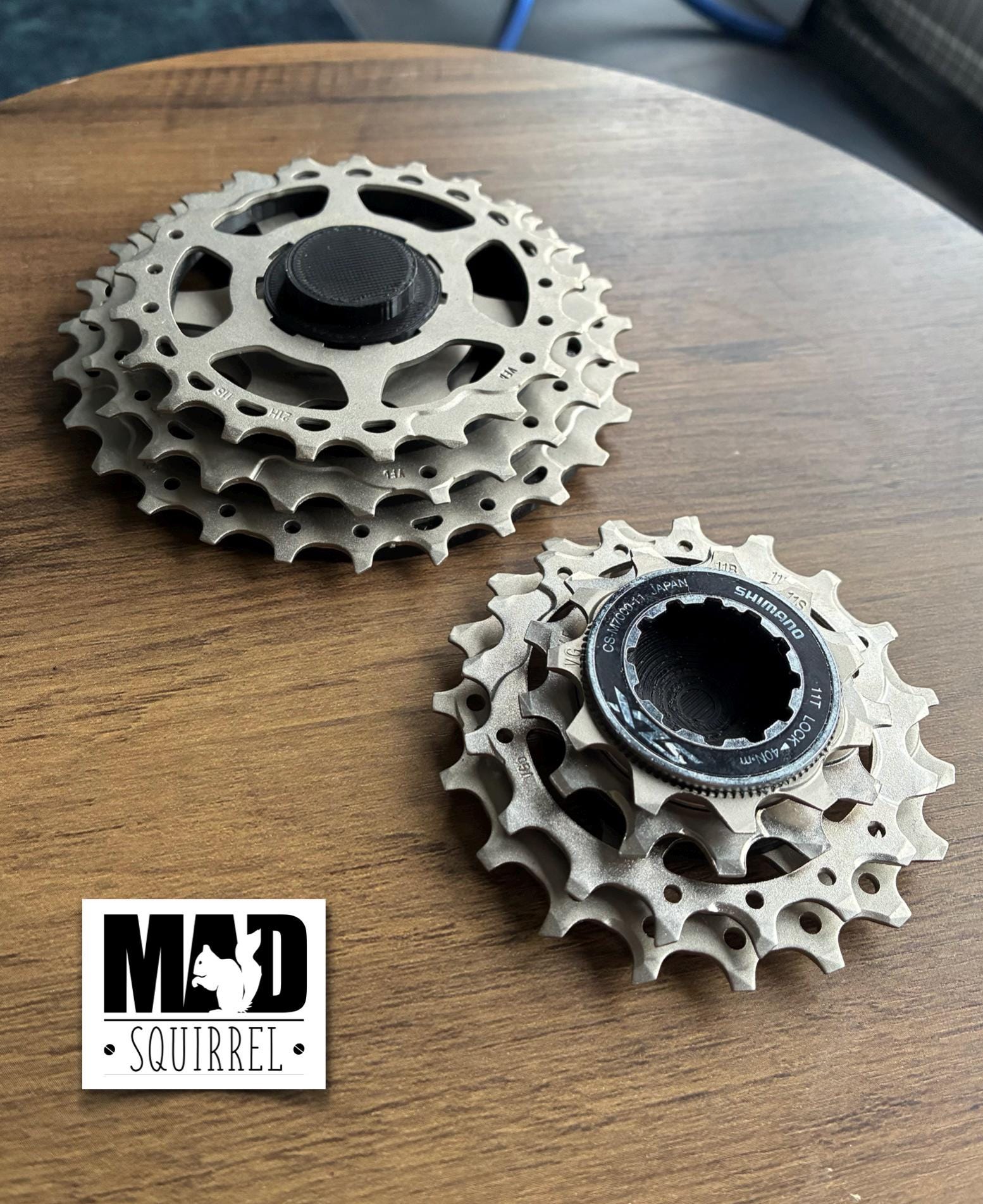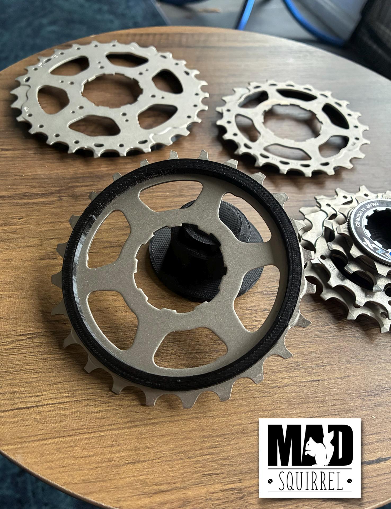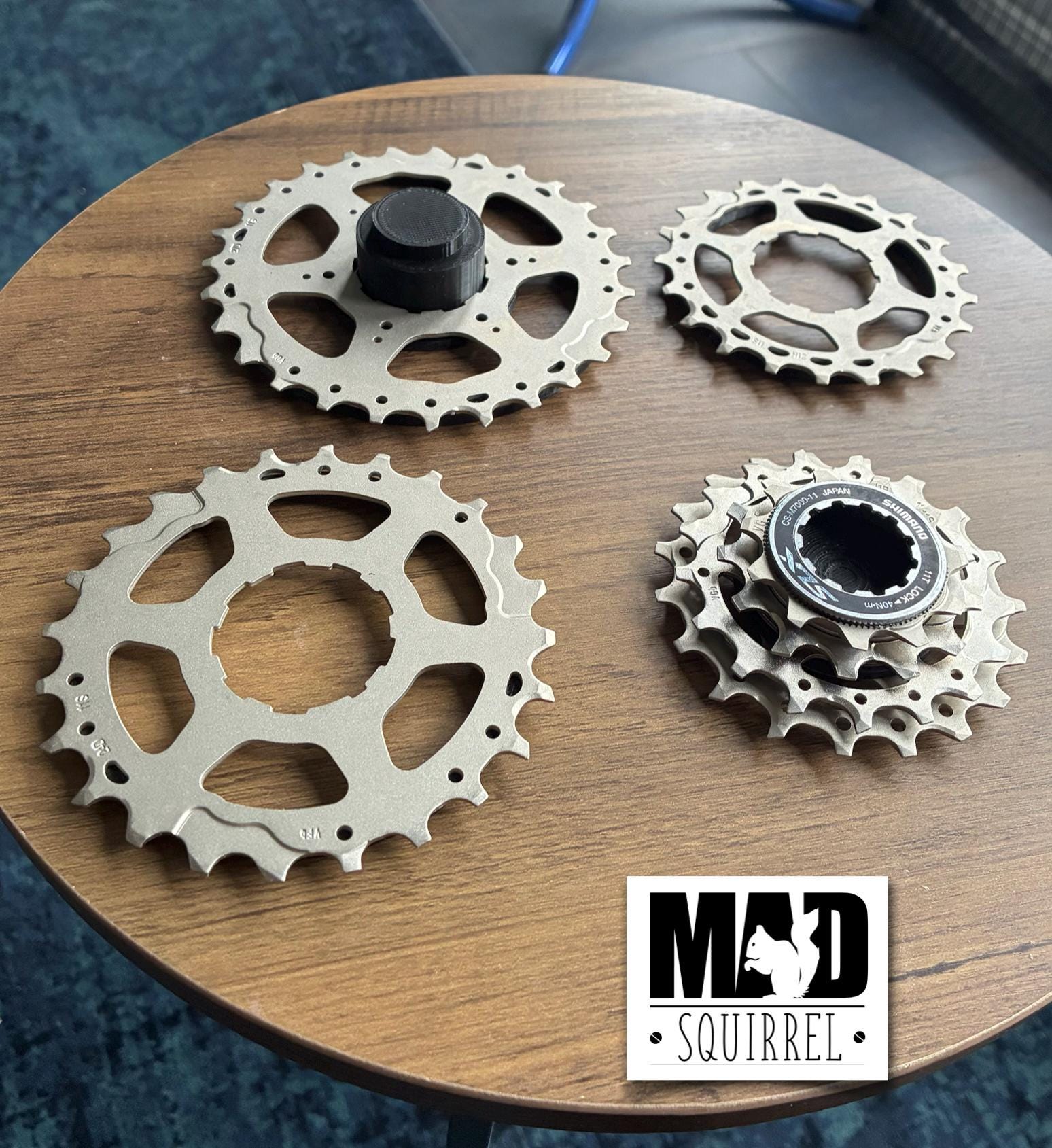 On the underside of the coaster there is a 3D printed plastic ring that keeps any hot cup/mug off a surface and keeps the sprocket from marking what it’s on. The ring also allows the coasters to be stacked nicely and gives the illusion of the rear cassette being complete and not a set of coasters.