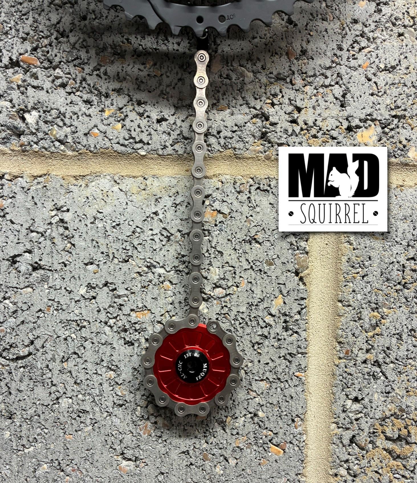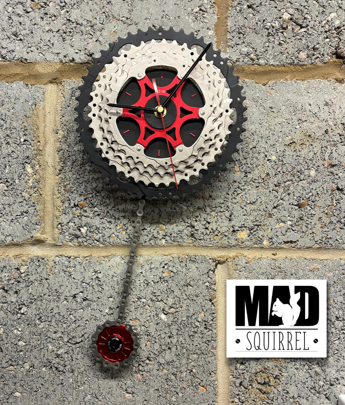 This Pendulum Clock has been made from the 4 largest rings of a 50T rear sprocket, with the pendulum made from a 13T jockey wheel, in anodised red. The centre spider of the rear sprocket is also anodised red. The largest sprocket is coloured black with the others silver. It has a specially made black clock face behind the centre spider, with the visible hours marked with short red lines. The hours visible behind the centre of the sprockets are 12, 2, 4, 6, 8, and 10.