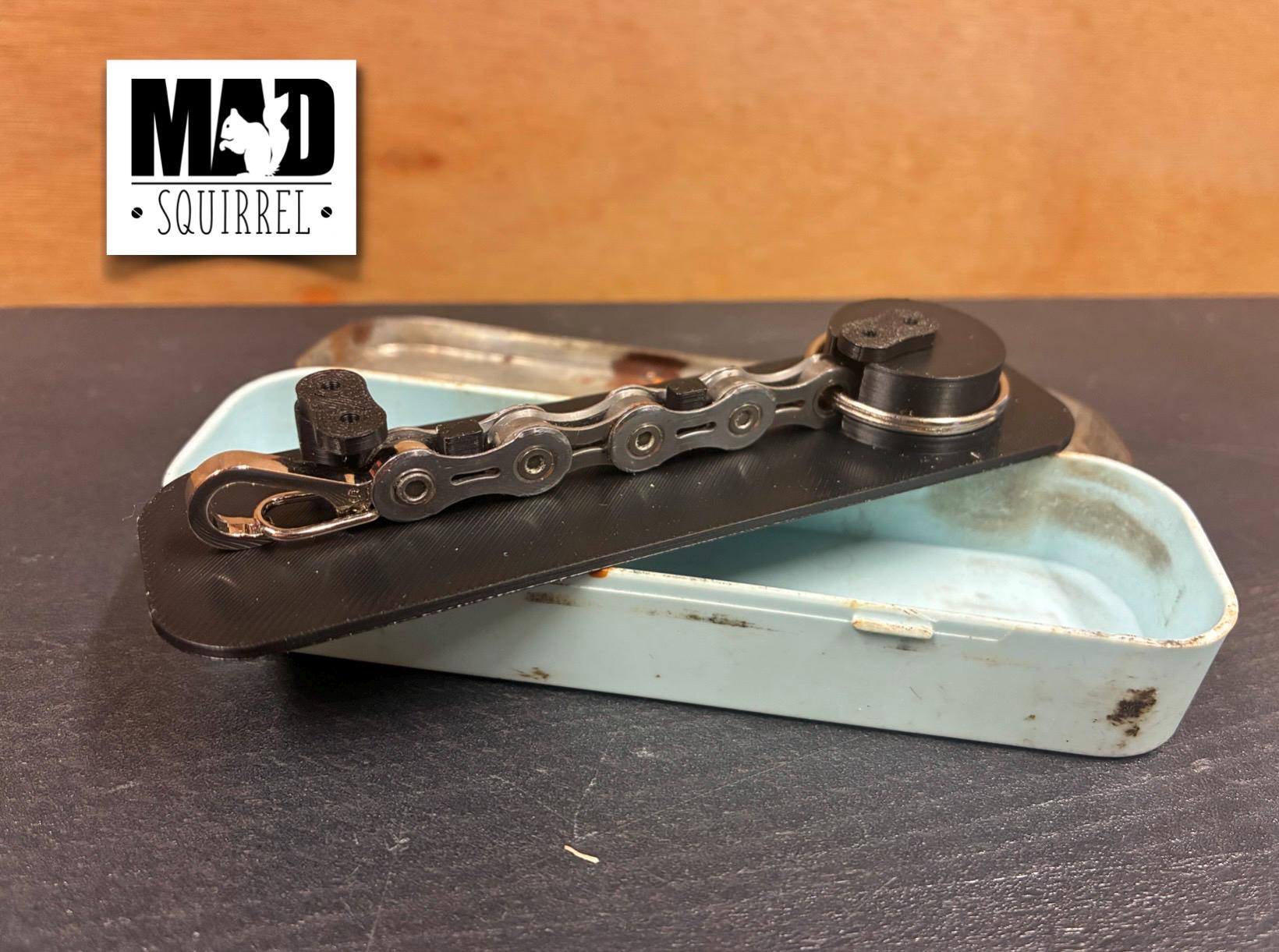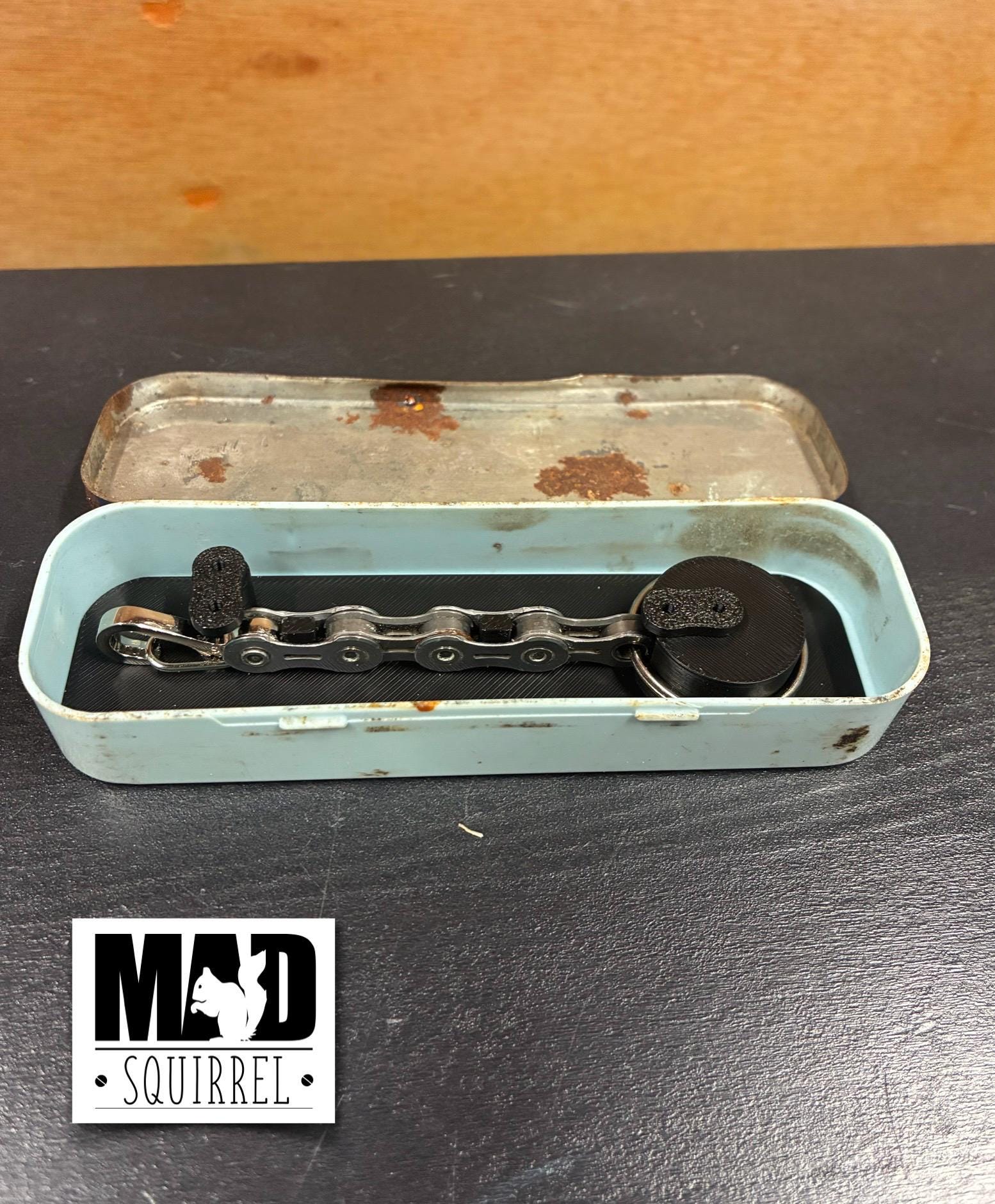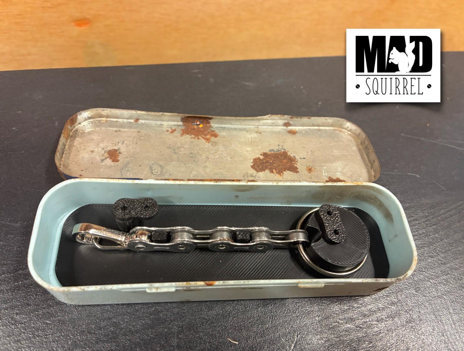 The key ring is held in place in the tin by a 3d printed insert, there are 2 twisting bars, shaped like chain links, that hold the key ring in place.