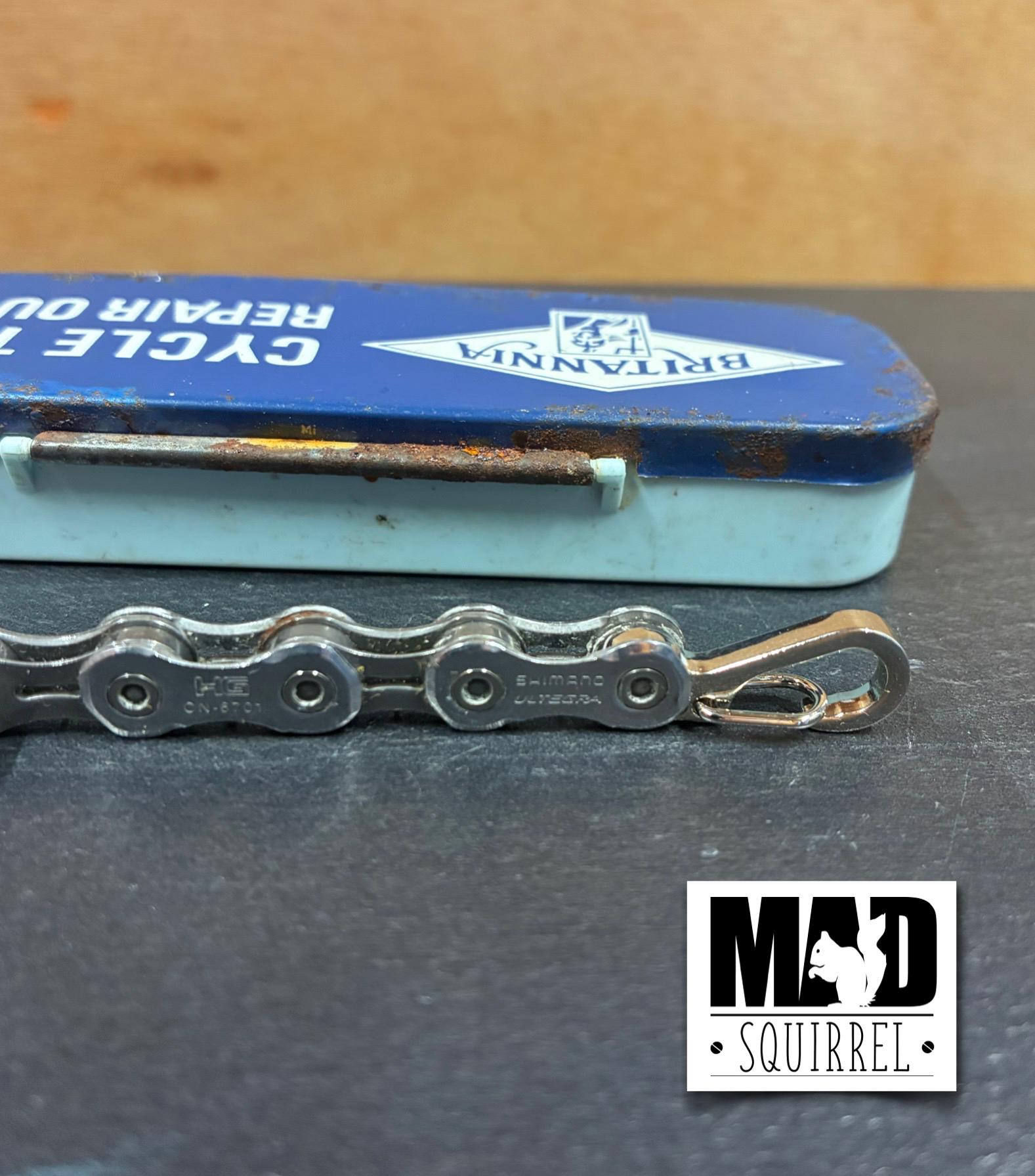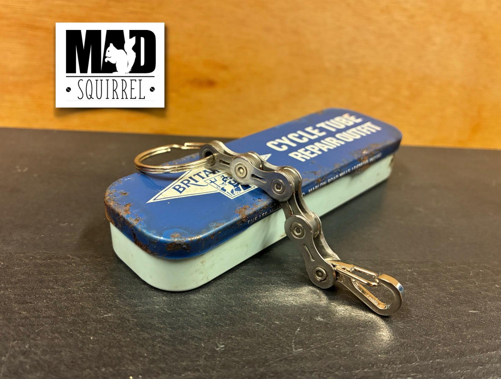The Bicycle Chain Keyring made from Shimano Ultegra chain, ideal gift for that cyclist or biker you know and made extra special with the addition of a Vintage Repair Tin as a gift box, very unusual and a surprise.