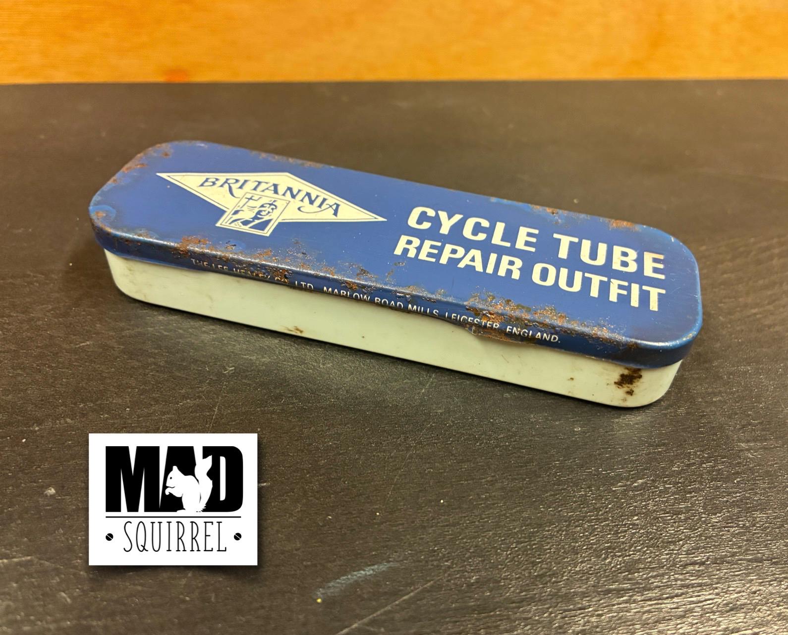 The repair tin is an original Britannia Repair Tin, with a plastic base and tin lid. Please note that it is an old tin and has marks and a little rust on it.
