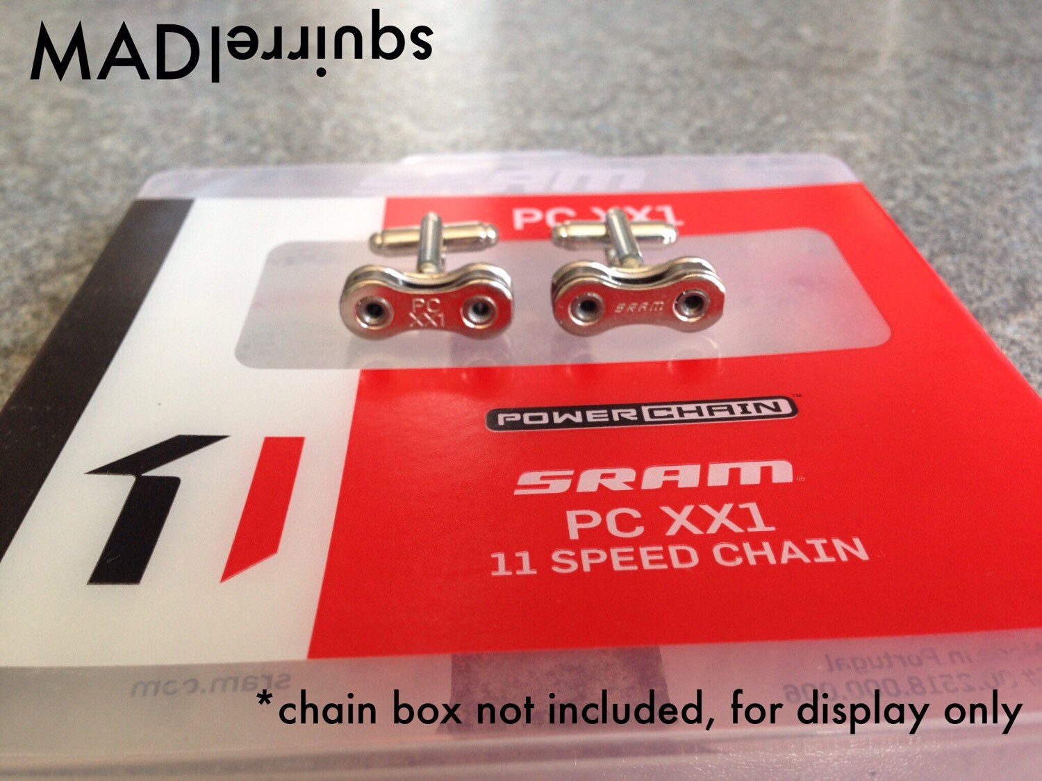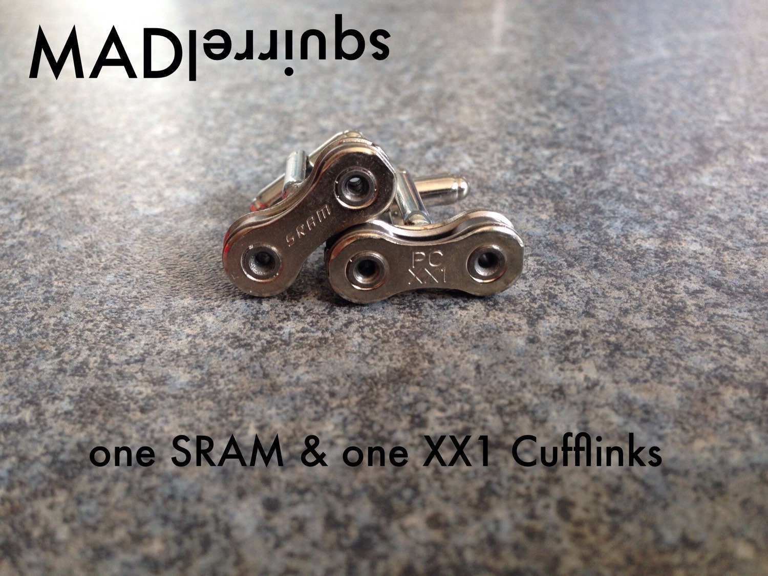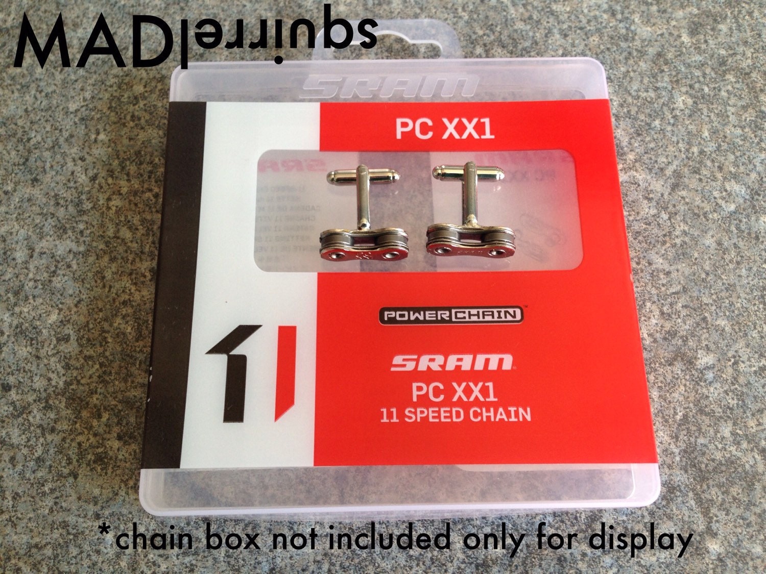 SRAM XX1 Mountain Bike Chain Link Cufflinks, made from one of SRAM's top of the range 11speed MTB Chains and come in a free pillow gift box, (please note that they do not come in the SRAM chain box shown in the photos as this is for illustration only)