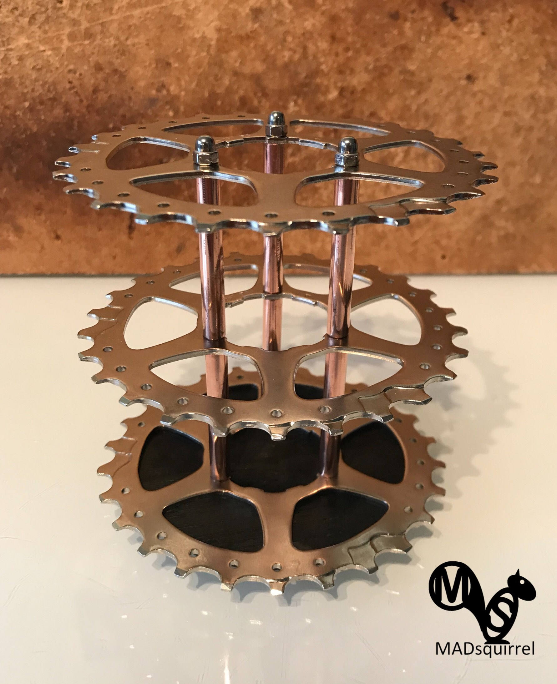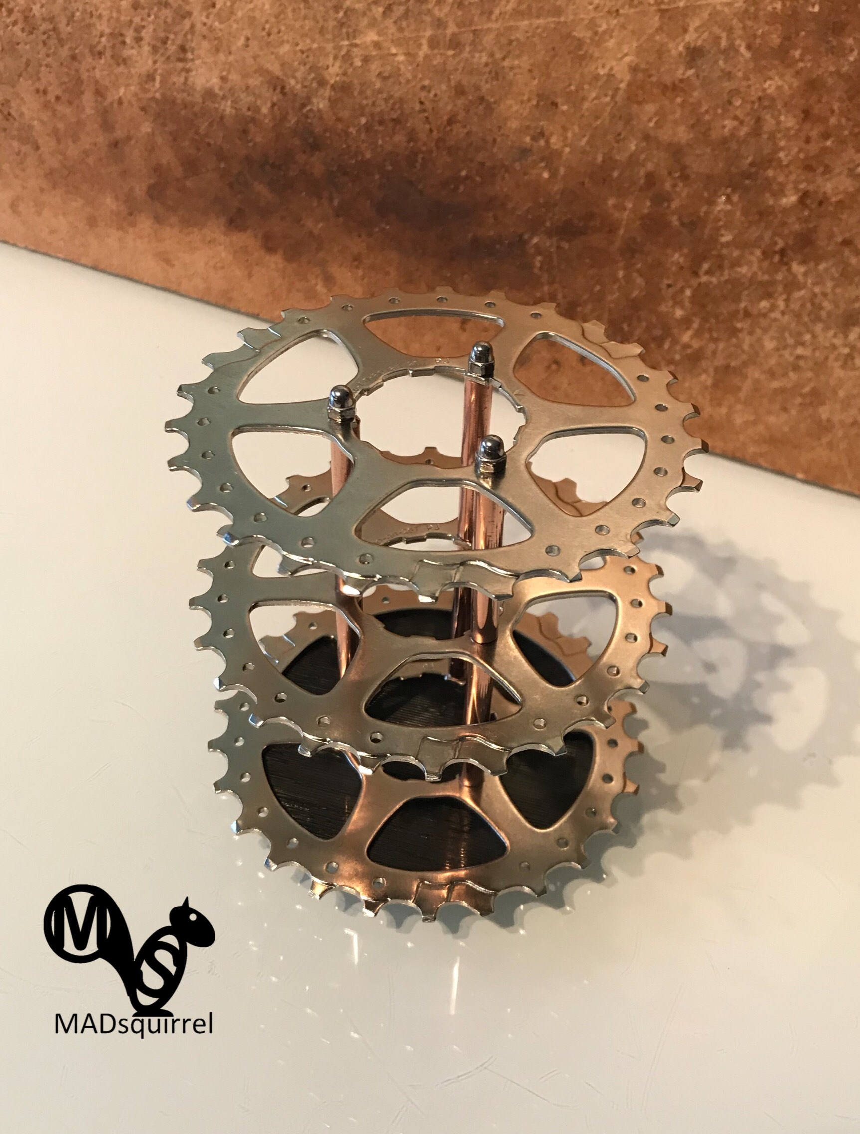 This is a beautifully made holder for pens, brushes or tools using 3 larger silver sprockets than the normal holder still from a rear cassette and polished copper tubes with chrome domed nuts to finish the top Sprocket off. The polished copper really sets the silver sprockets of wonderfully.