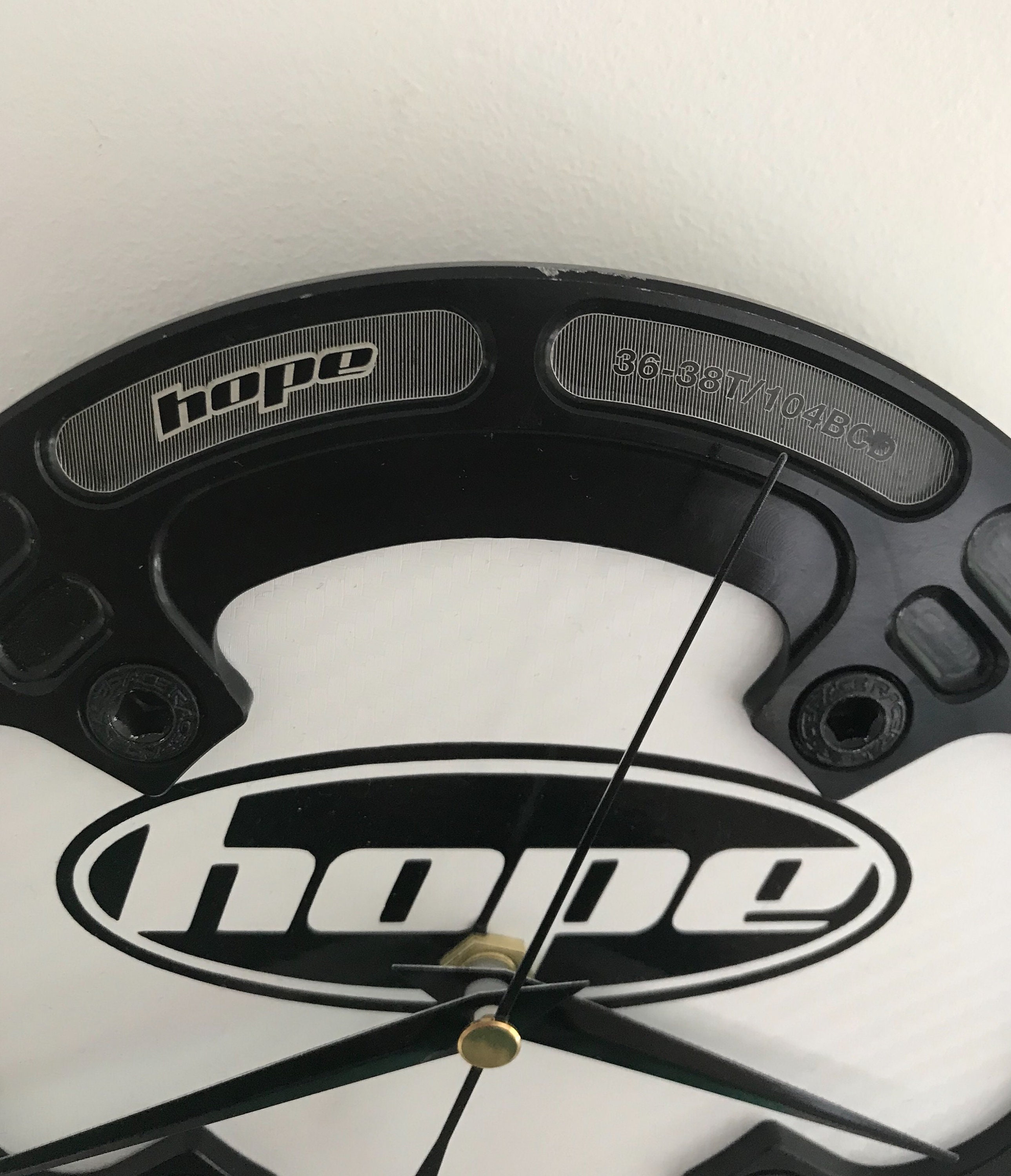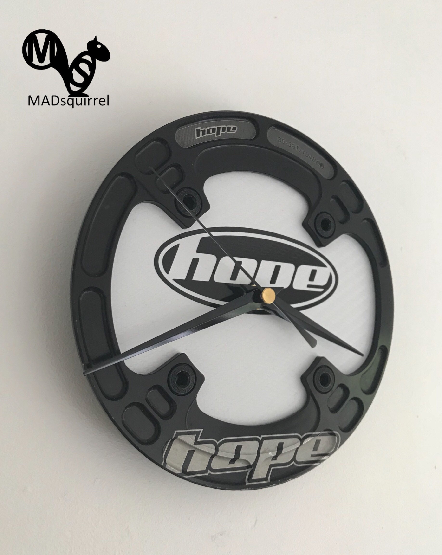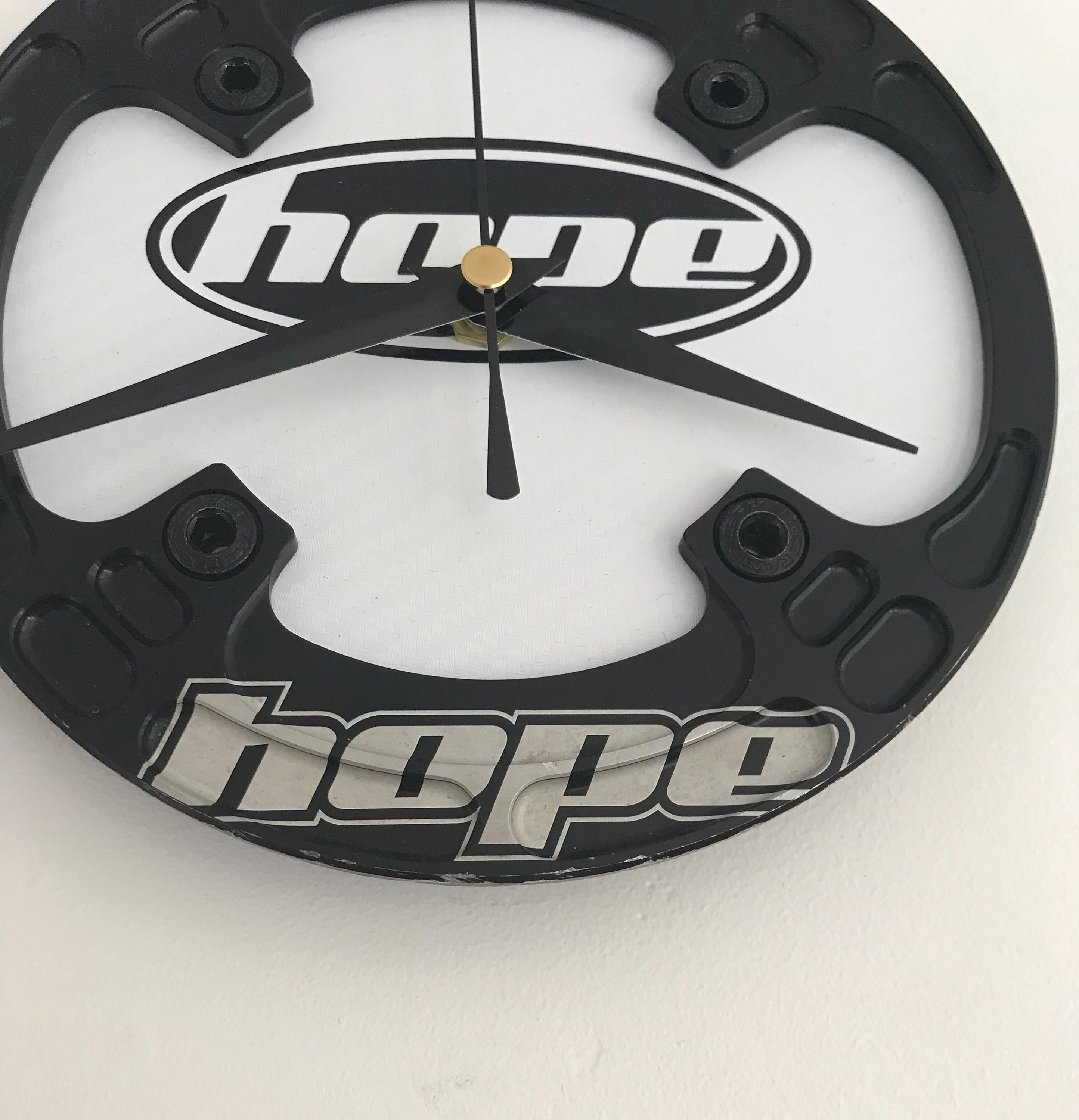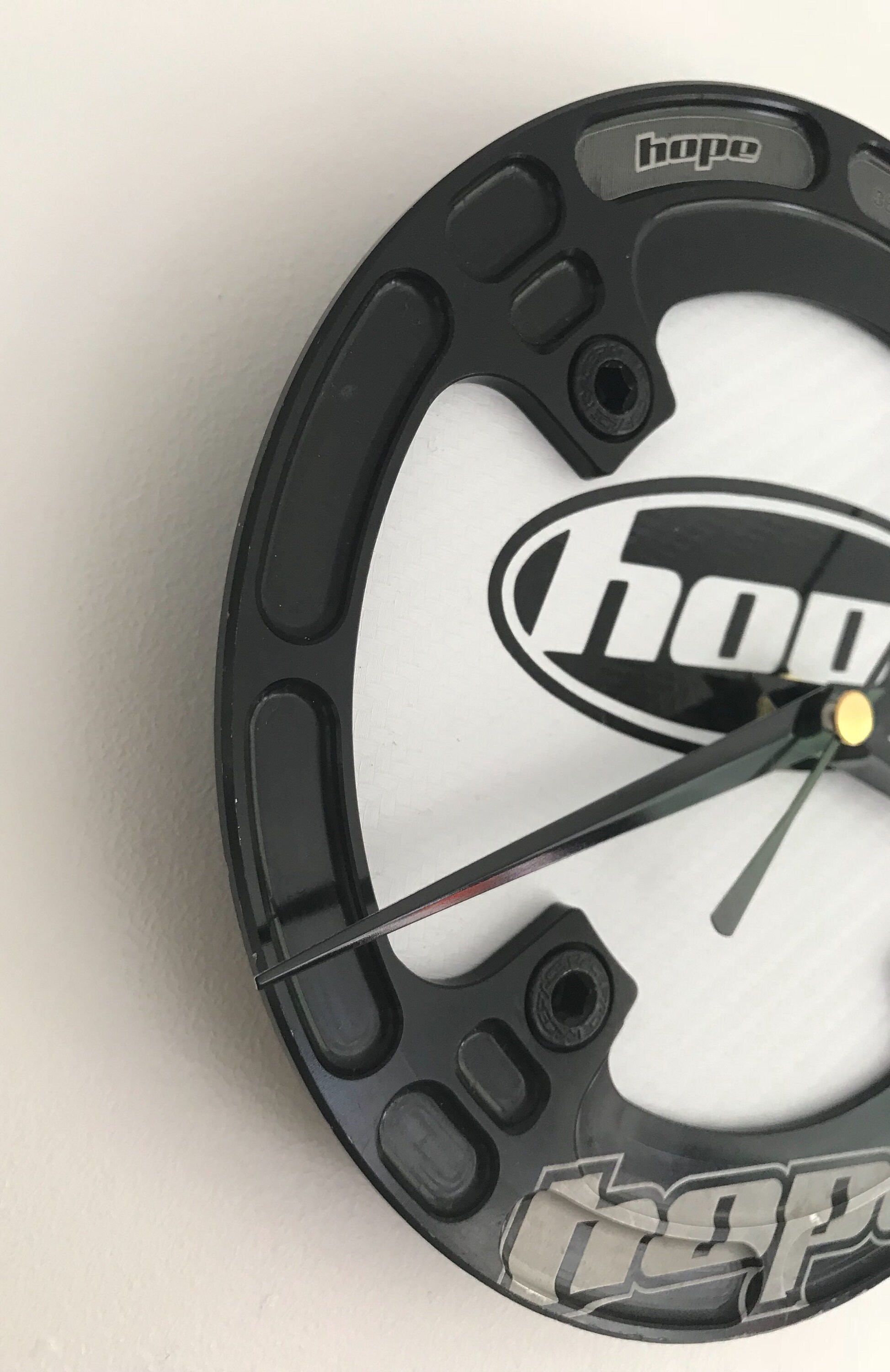 This beautiful clock uses a pre-loved Black Hope Chain Bash Guard, 36-38T, with a White Carbon Fibre Effect Face and Black Hands. There is a black hope decal in the centre of the face to add a great finishing touch.