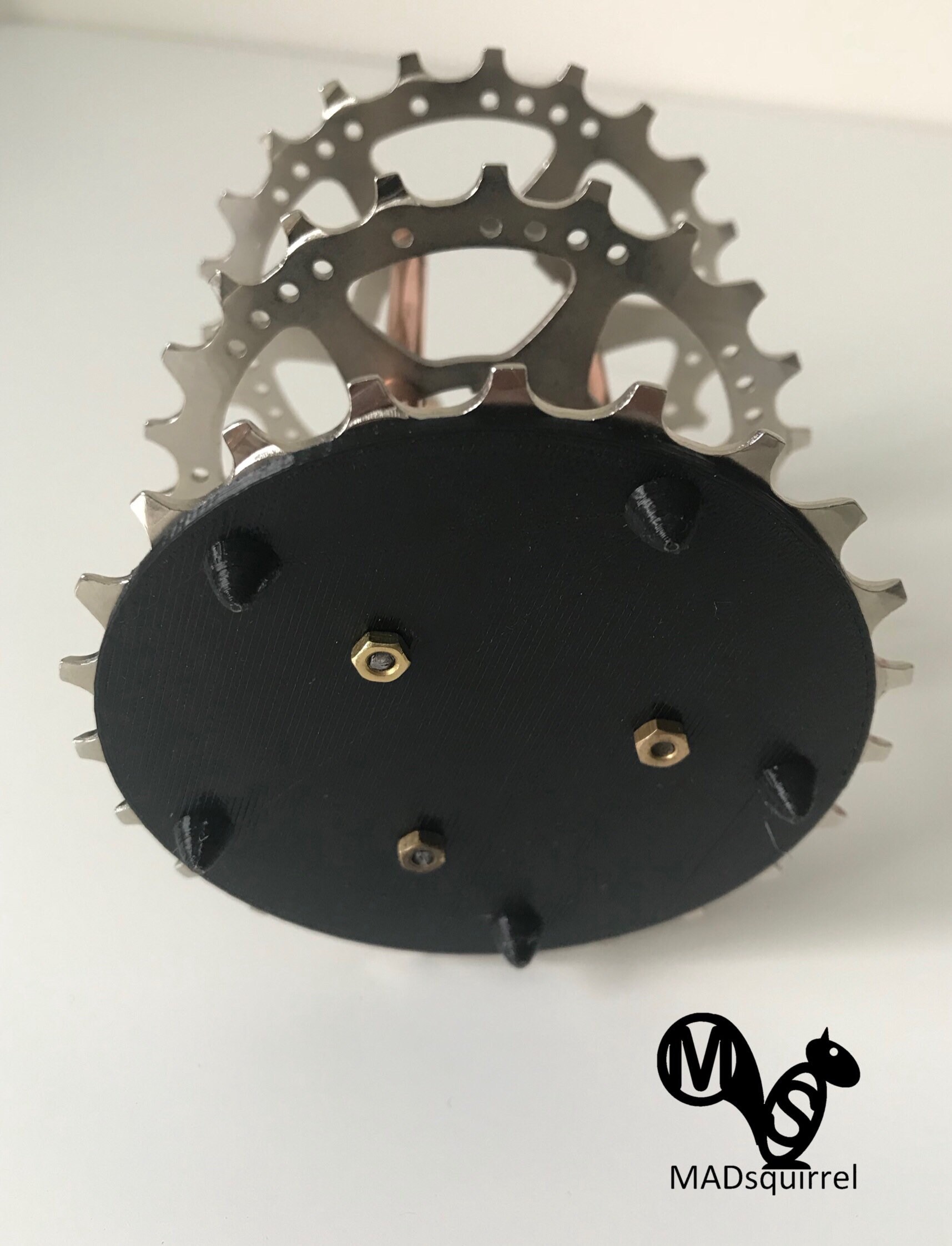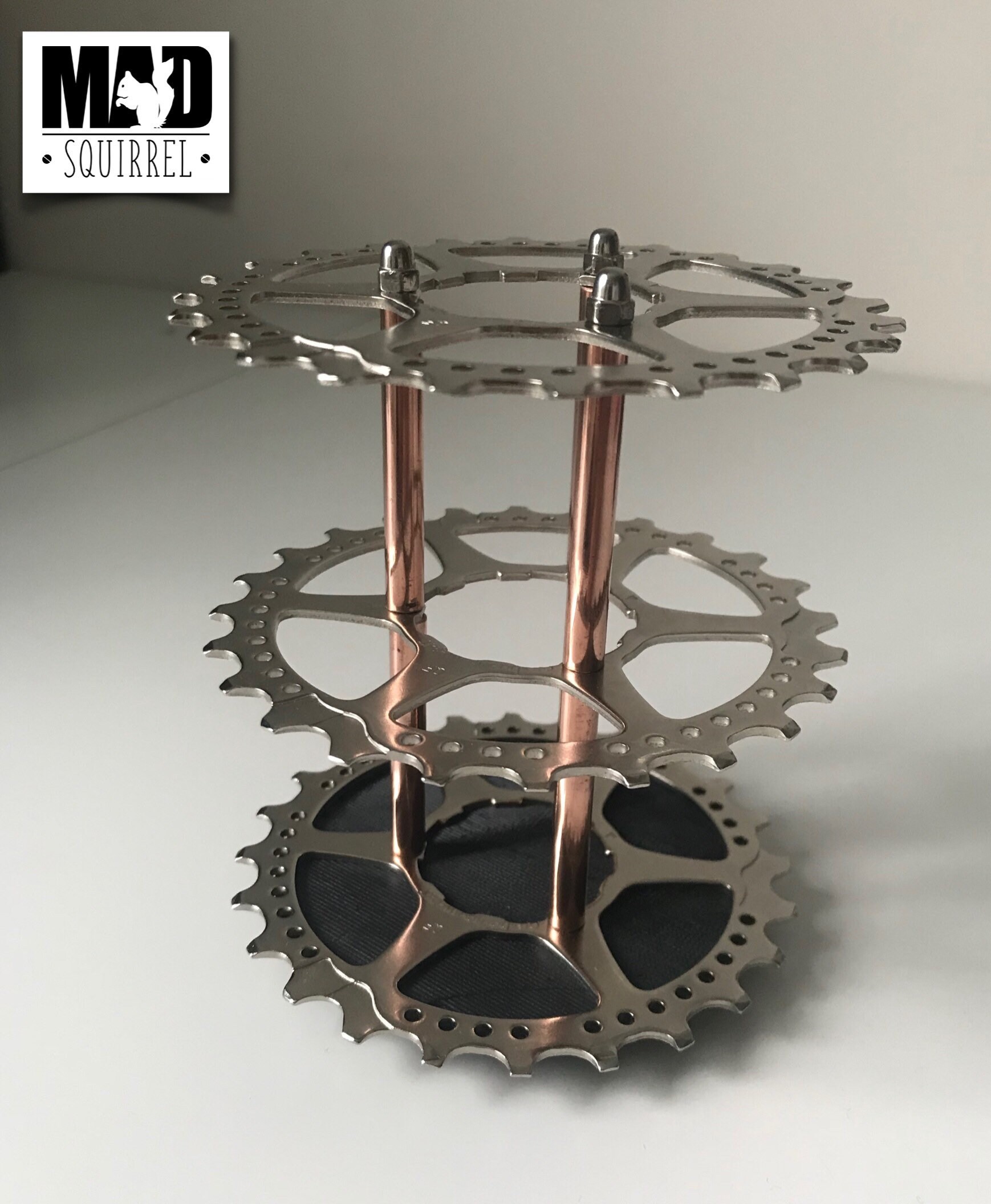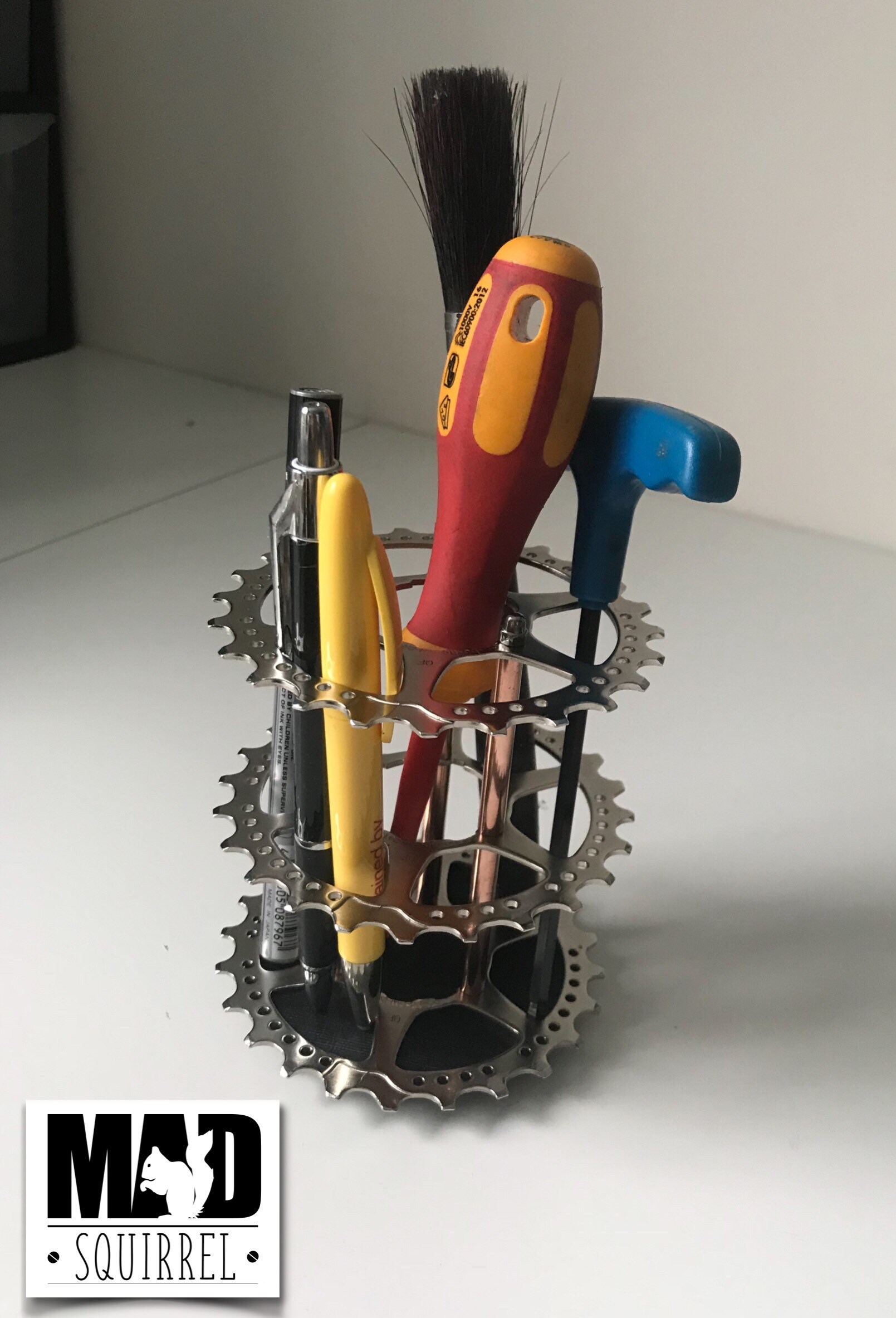 A beautifully made holder for pens, brushes or tools using 3 silver sprockets from a rear cassette and copper tubes with chrome domed nuts to finish the top Sprocket off.