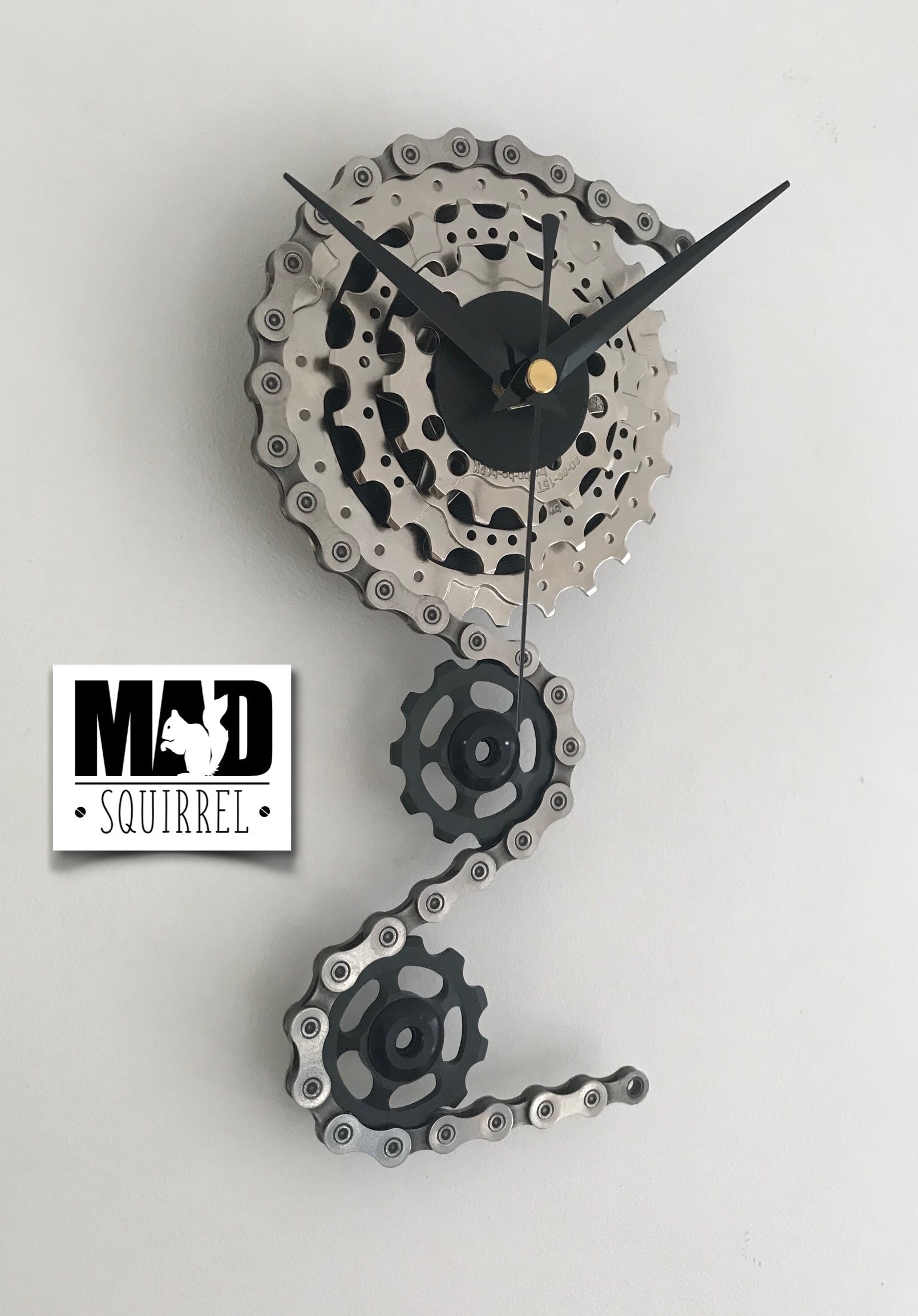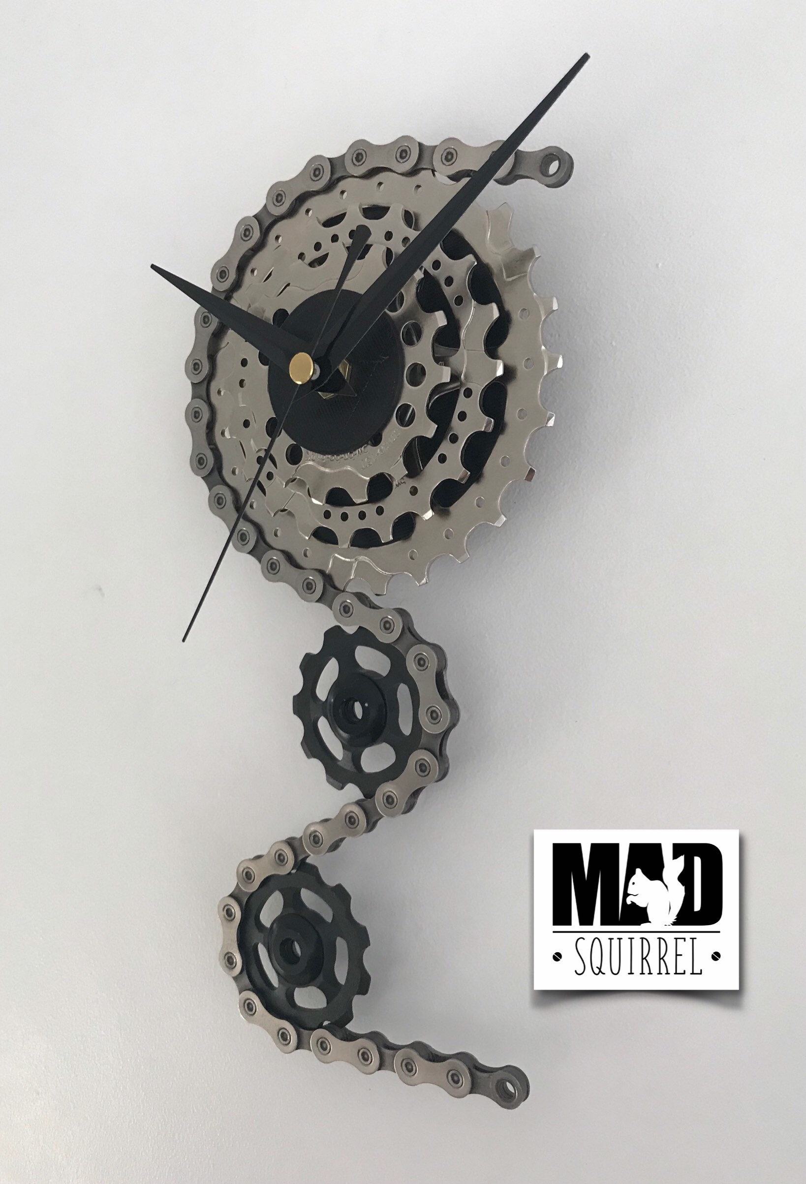 This Triple Sprocket Clock from MADsquirrel has been created from part of the rear cassette. This clock uses 3 rear cassette sprockets, 2 jockey wheels from a rear derailleur which are black with a polished grey chain to finish the clock off. This open face clock shows off more of the cassette section and has a small face unlike older versions.