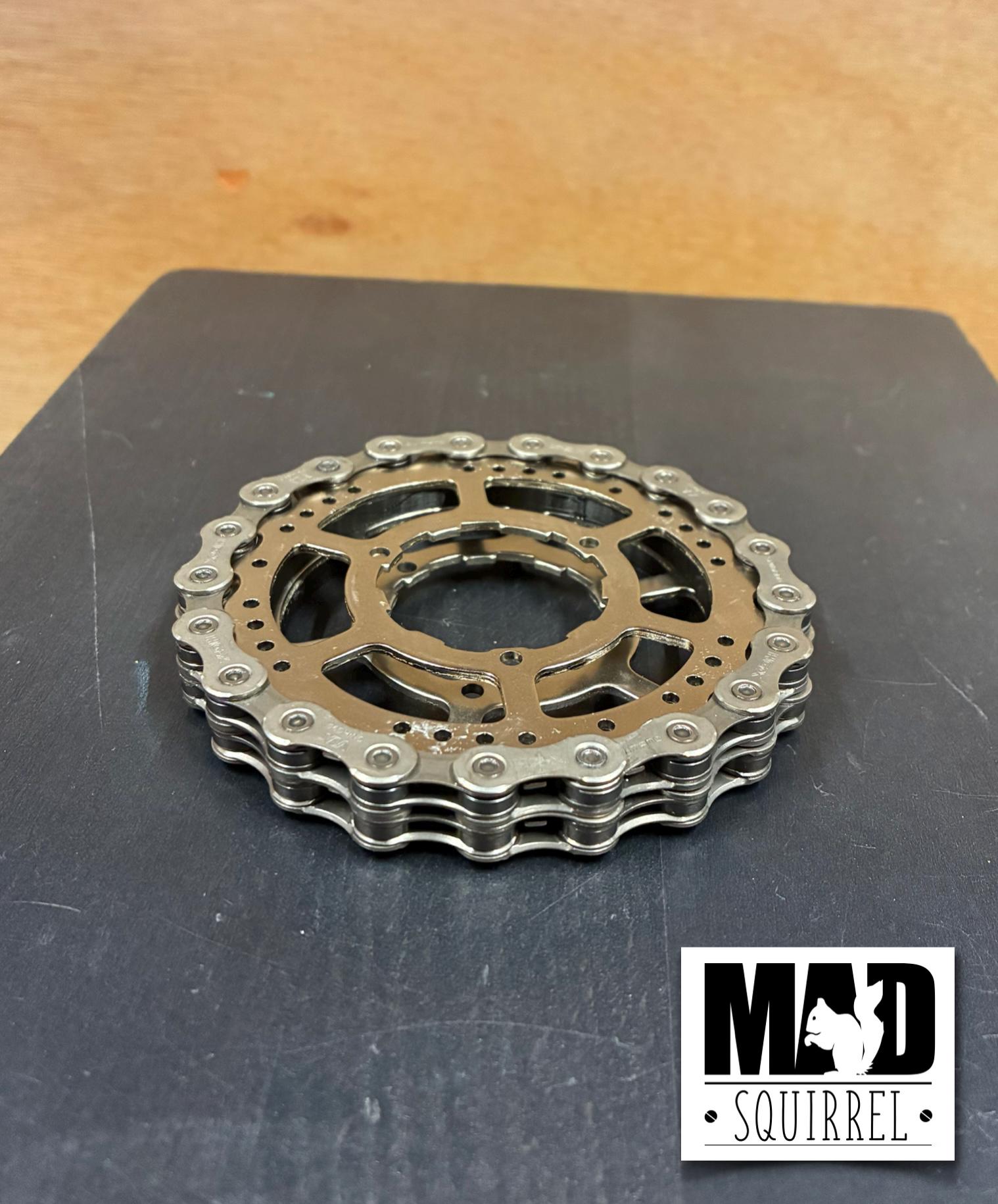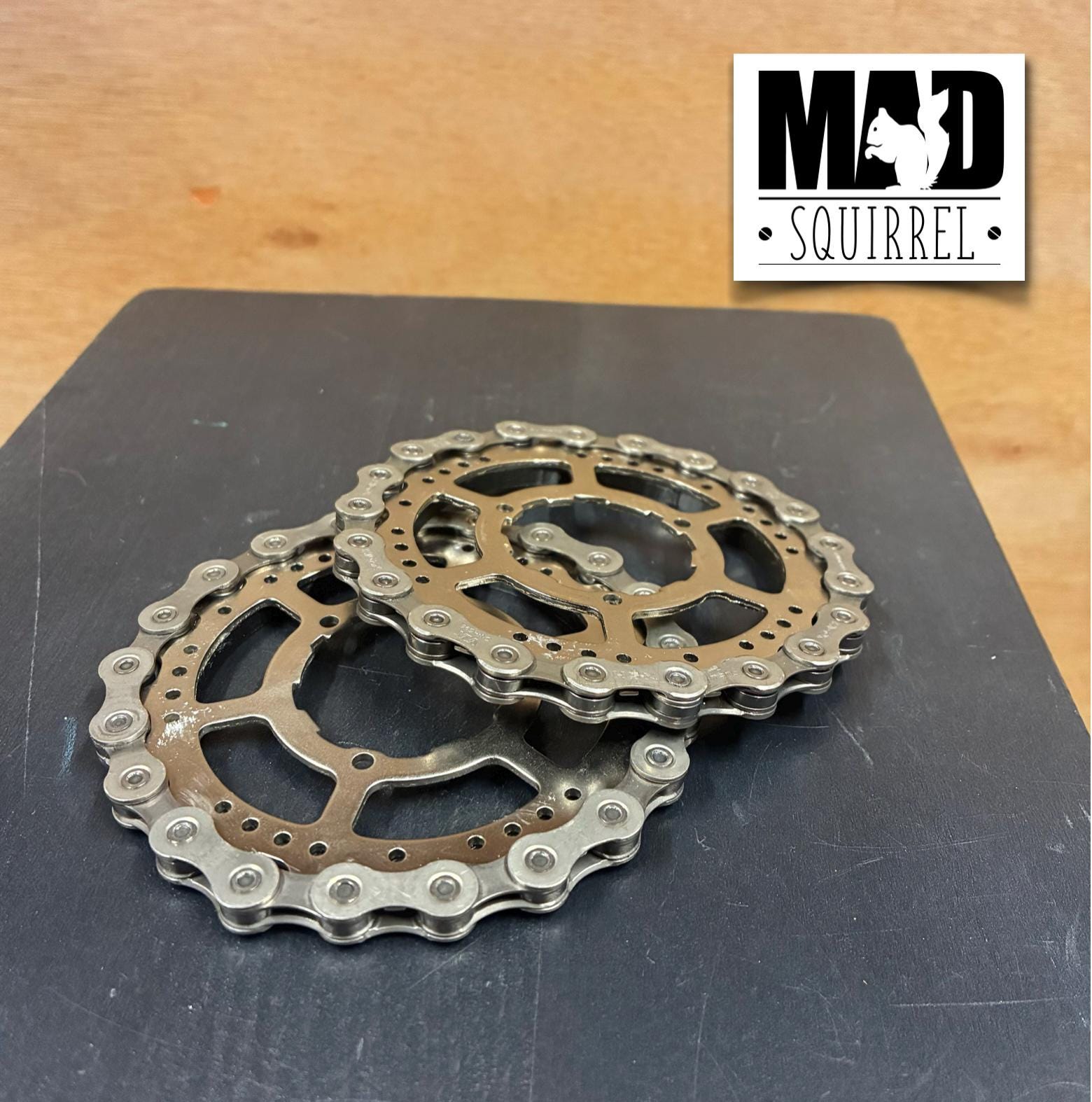 These wonderful unique drink coasters are made from a Bicycle’s rear cassette sprocket and chain. They are nicely weighted due to the chain around the edge, the sprocket makes a lovely stable base for a mug or glass. Two coasters are included in this listing as shown in the photos.