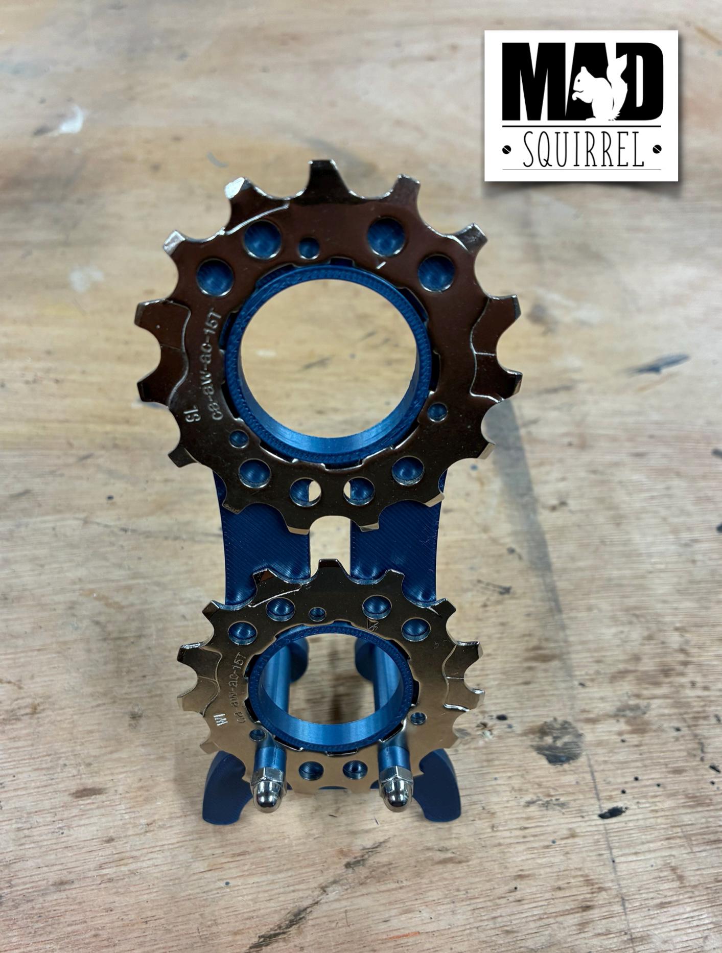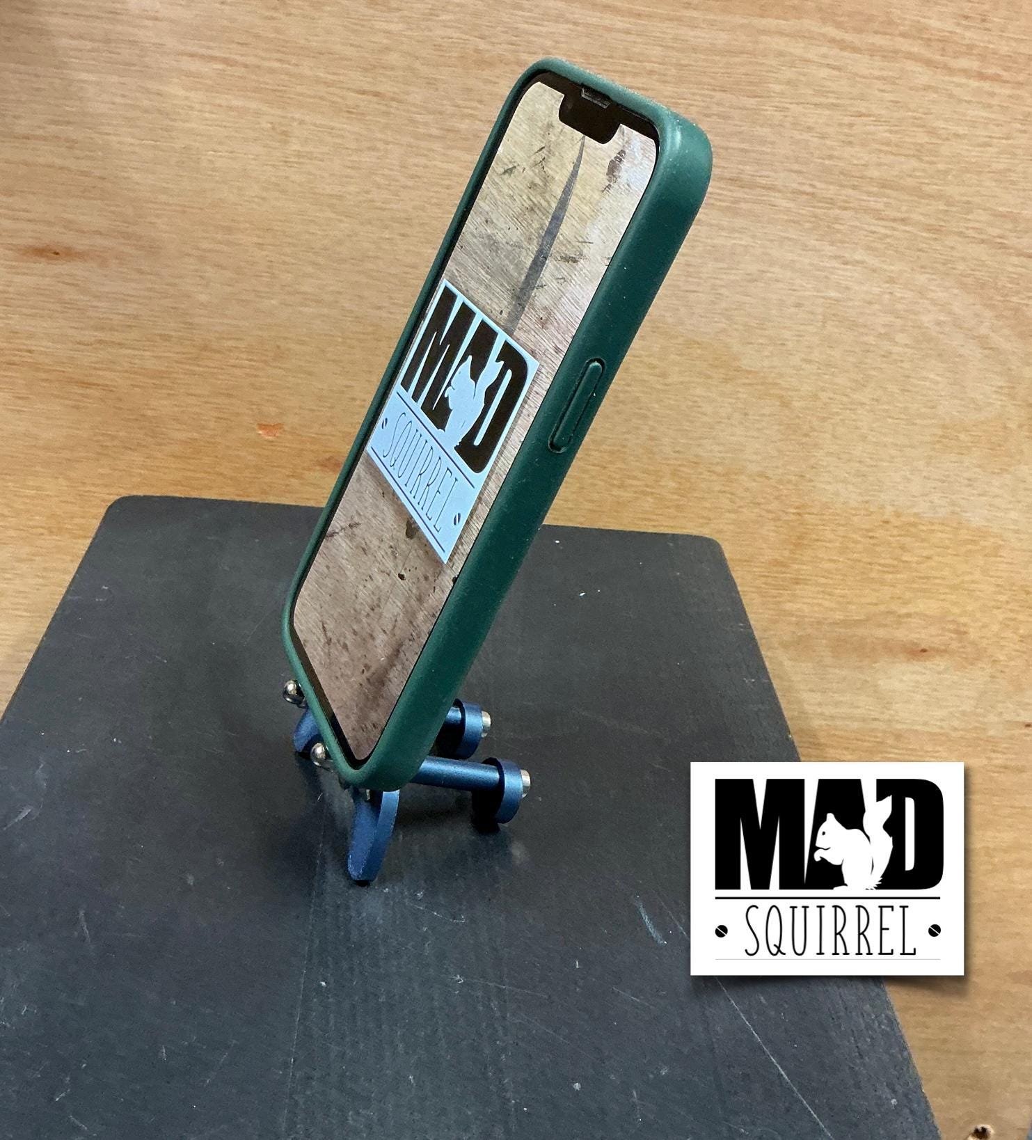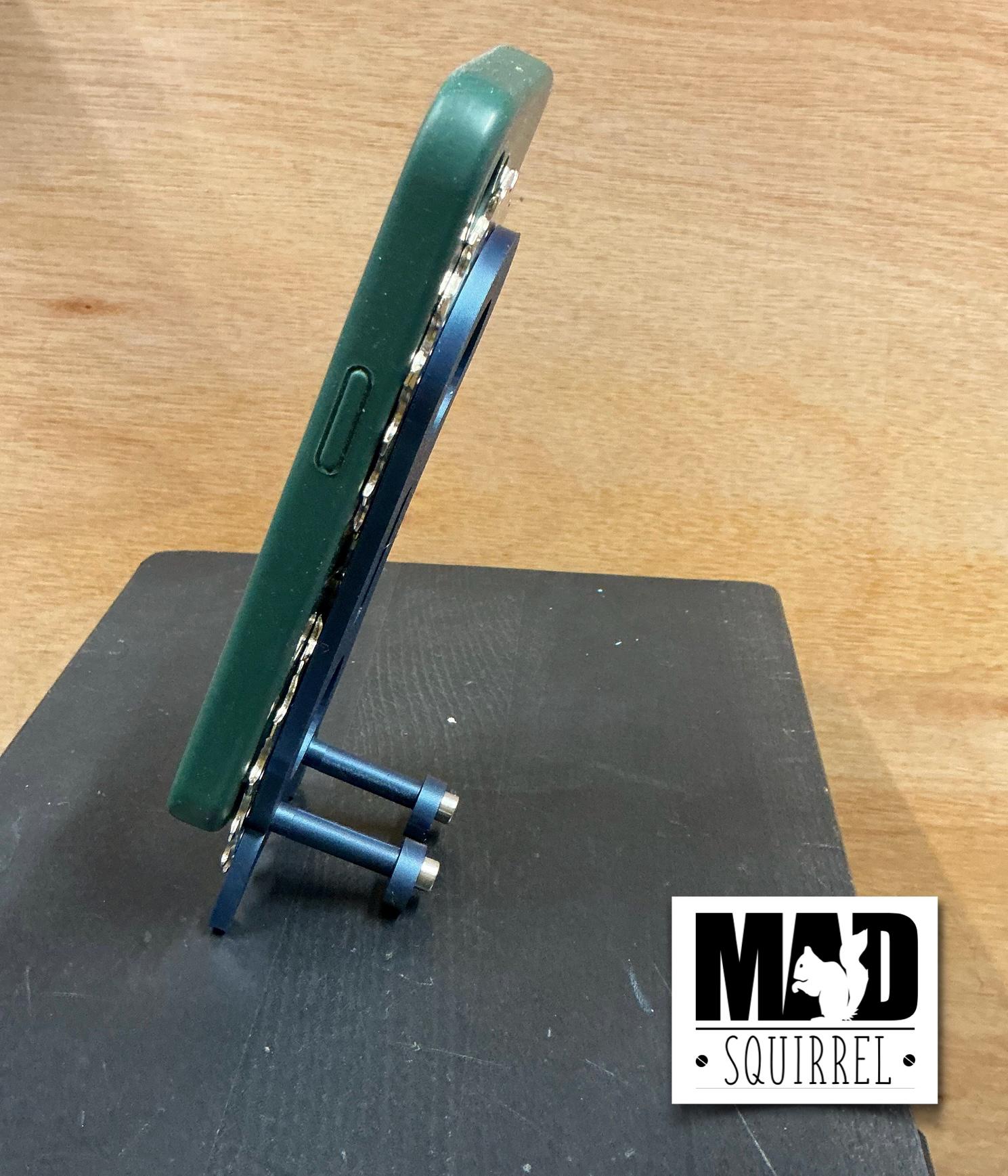 This beautiful and stylish bicycle inspired standard sized smart phone holder has been designed and made by MADsquirrel. It has been made from a 3d printed back and legs with two sprockets from a rear cassette on the front. Ideal for a desk, work bench, sideboard or bedside cabinet. The back support is designed to look like a chain link.